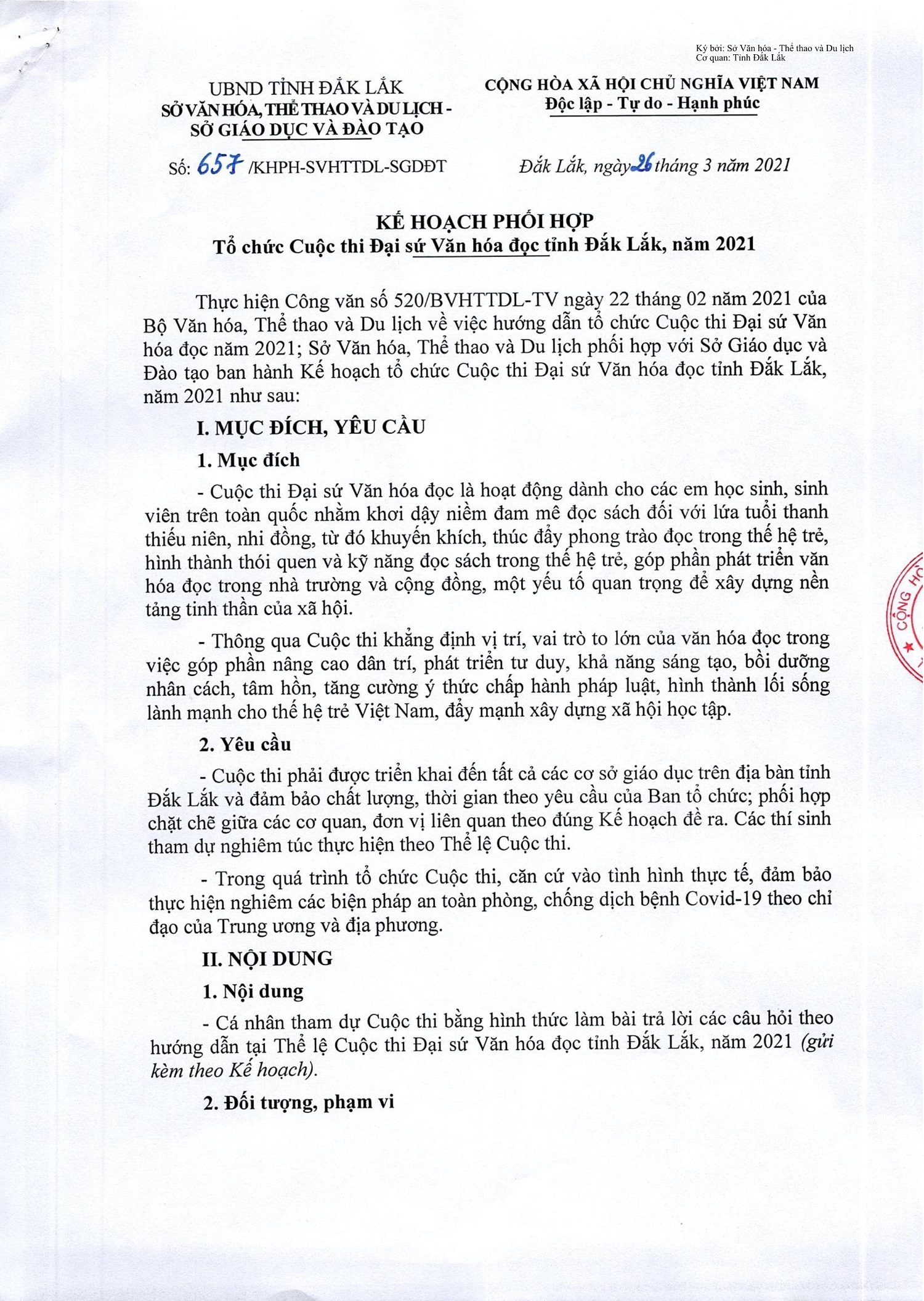 Kế hoạch phối hợp Tổ chức Cuộc thi Đại sứ Văn hóa đọc tỉnh Đắk Lắk, năm 2021